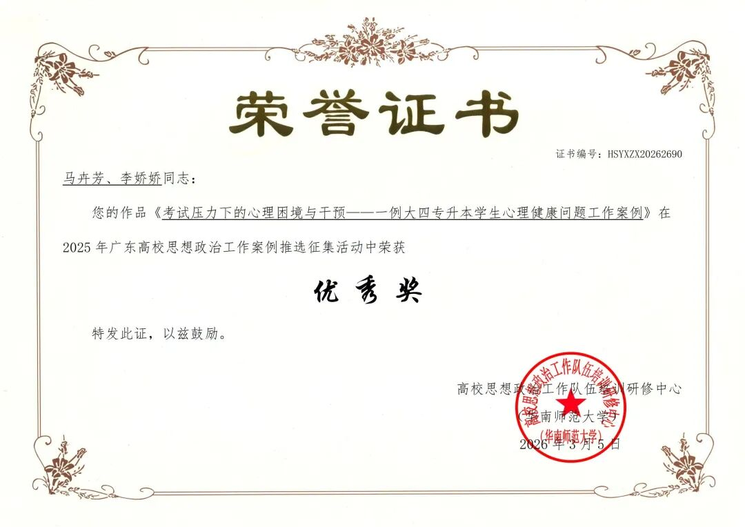 马卉芳、李娇娇老师的《考试压力下的心理困境与干预——一例大四专升本学生心理健康问题工作案例》荣获2025年广东高校思想政治工作案例优秀奖。