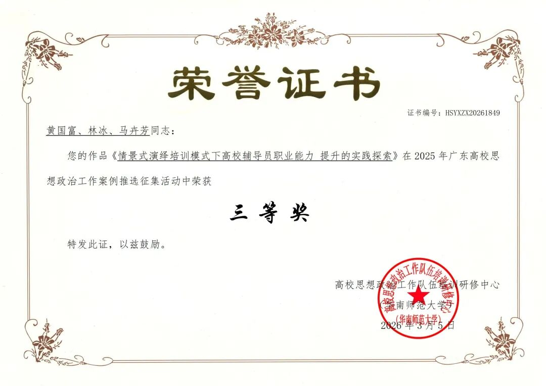 黄国富、林冰、马卉芳老师的《情景式演绎培训模式下高校辅导员职业能力提升的实践探索》荣获2025年广东高校思想政治工作案例三等奖。