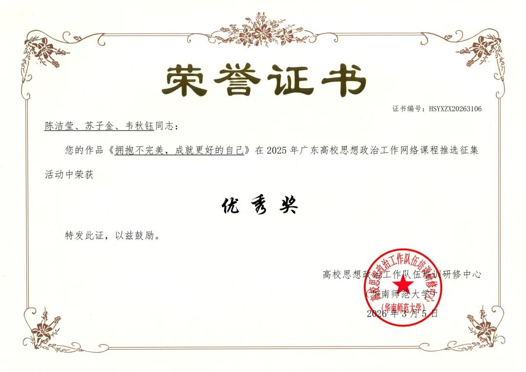 陈洁莹、苏子金、韦秋钰老师的《拥抱不完美,成就更好的自己》荣获2025年广东高校思想政治工作网络课程优秀奖。