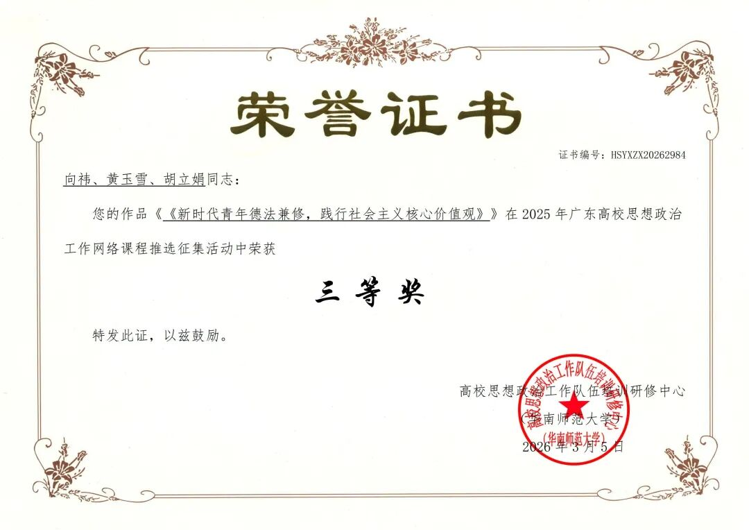 向祎、黄玉雪、胡立娟老师的《新时代青年德法兼修,践行社会主义核心价值观》荣获2025年广东高校思想政治工作网络课程三等奖。