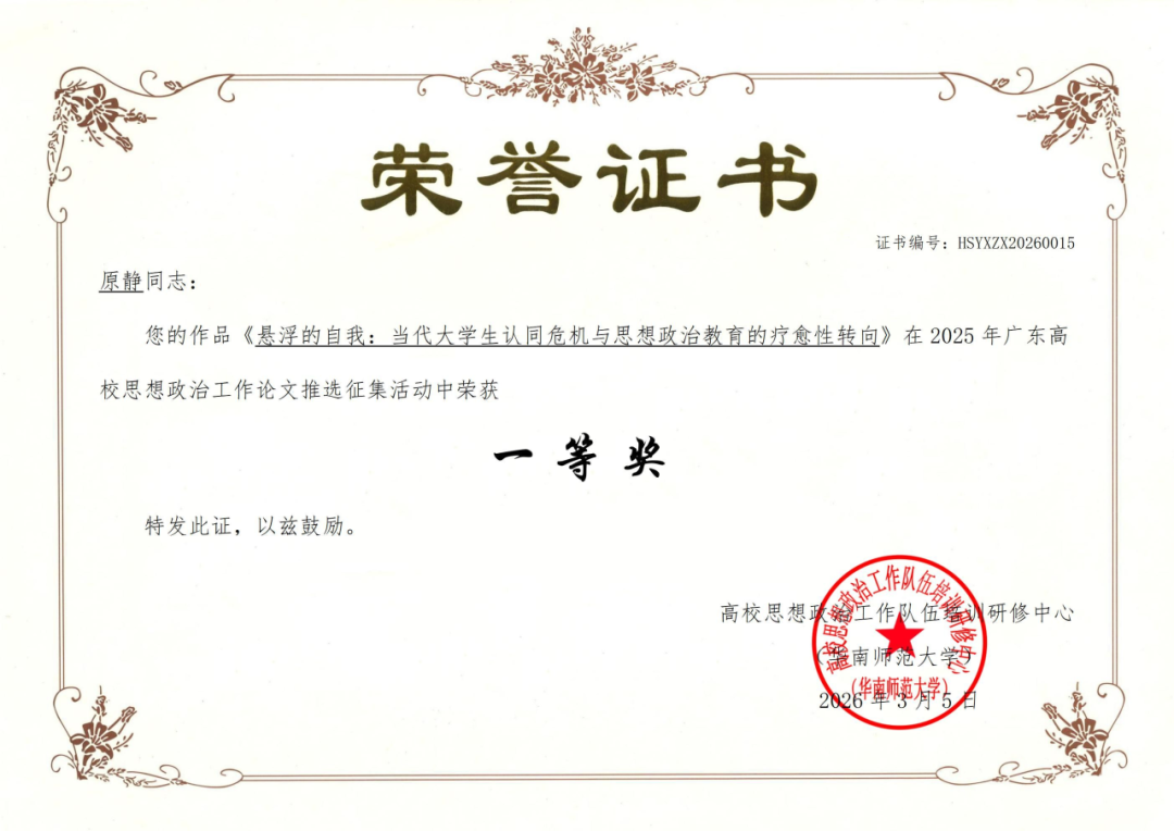 原静老师的《悬浮的自我:当代大学生认同危机与思想政治教育的疗愈性转向》荣获2025年广东高校思想政治工作论文一等奖。