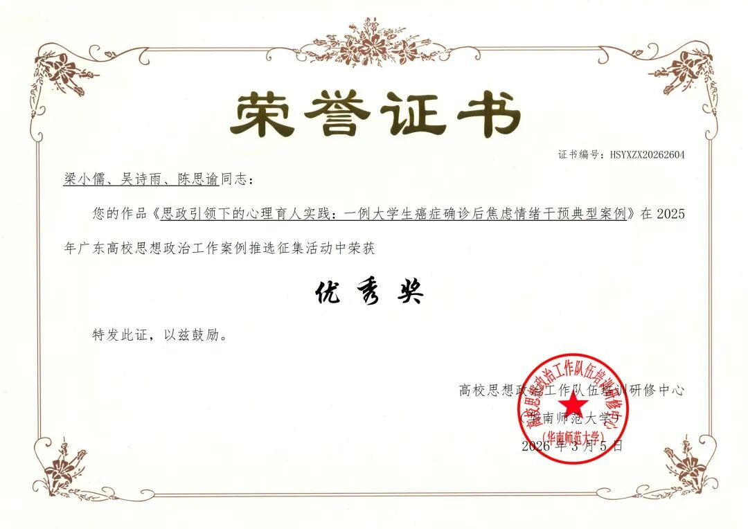 梁小儒、吴诗雨、陈思逾老师的《思政引领下的心理育人实践:一例大学生癌症确诊后焦虑情绪干预典型案例》荣获2025年广东高校思想政治工作案例优秀奖。