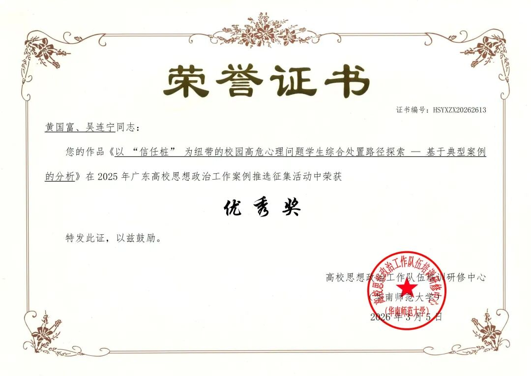 黄国富、吴连宁老师的《以“信任桩”为纽带的校园高危心理问题学生综合处置路径探索—基于典型案例的分析》荣获2025年广东高校思想政治工作案例优秀奖。