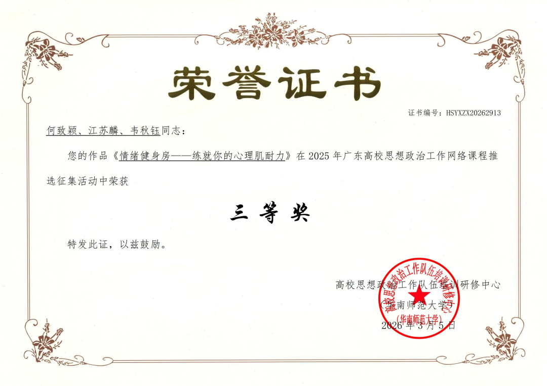 何致颖、江苏麟、韦秋钰老师的《情绪健身房——练就你的心理肌耐力》荣获2025年广东高校思想政治工作网络课程三等奖。