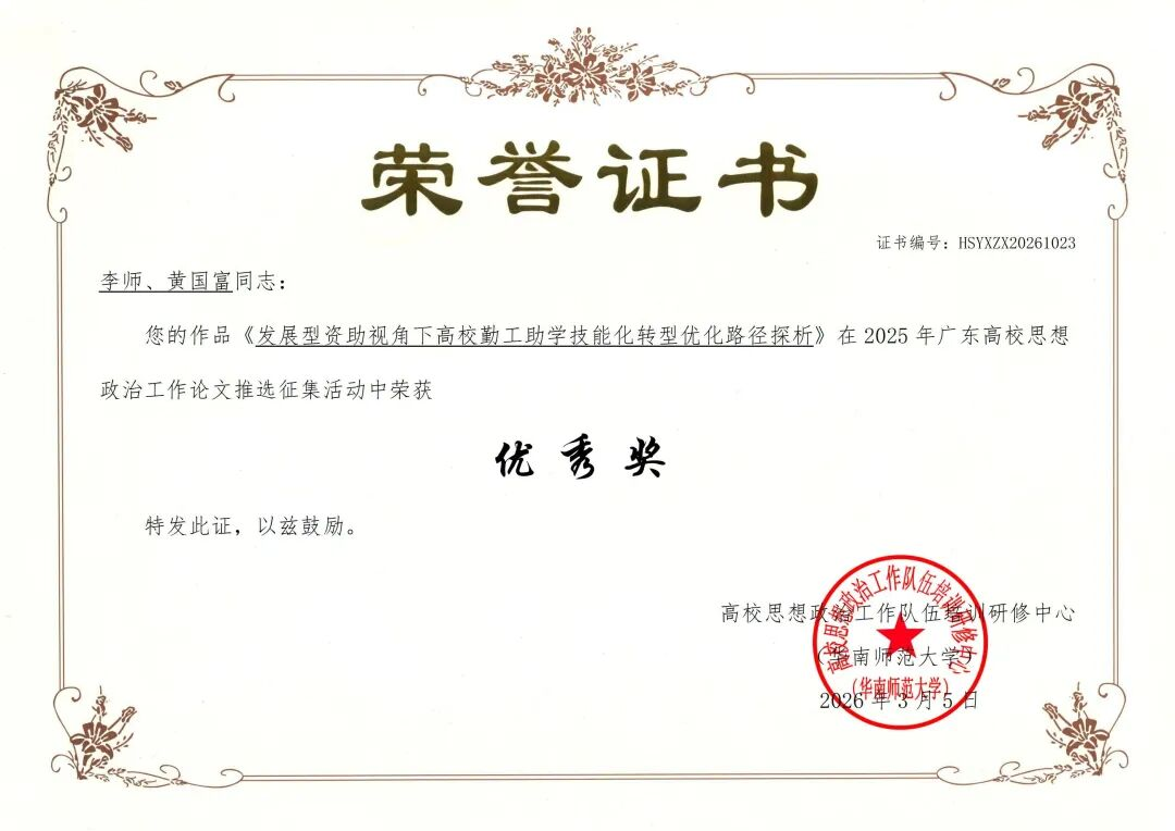 李师、黄国富老师的《发展型资助视角下高校勤工助学技能化转型优化路径探析》荣获2025年广东高校思想政治工作论文优秀奖。