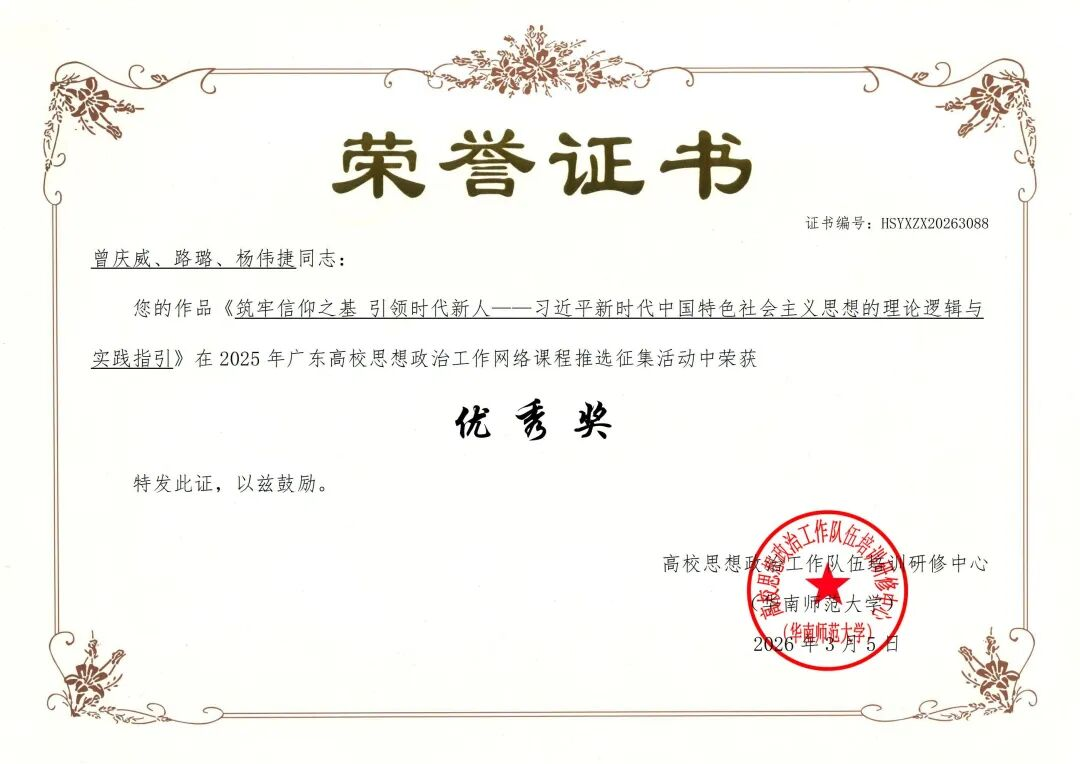 曾庆威、路璐、杨伟捷老师的《筑牢信仰之基 引领时代新人——习近平新时代中国特色社会主义思想的理论逻辑与实践指引》荣获2025年广东高校思想政治工作网络课程优秀奖。