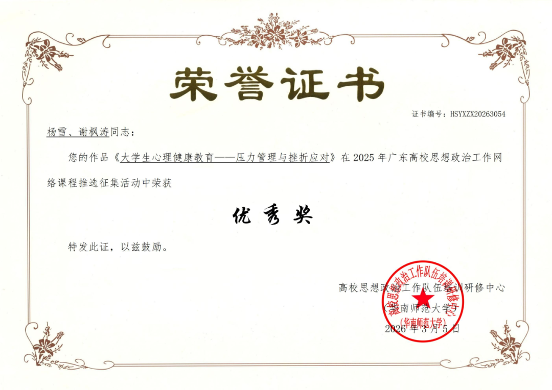 杨雪、谢枫涛老师的《大学生心理健康教育——压力管理与挫折应对》荣获2025年广东高校思想政治工作网络课程优秀奖。