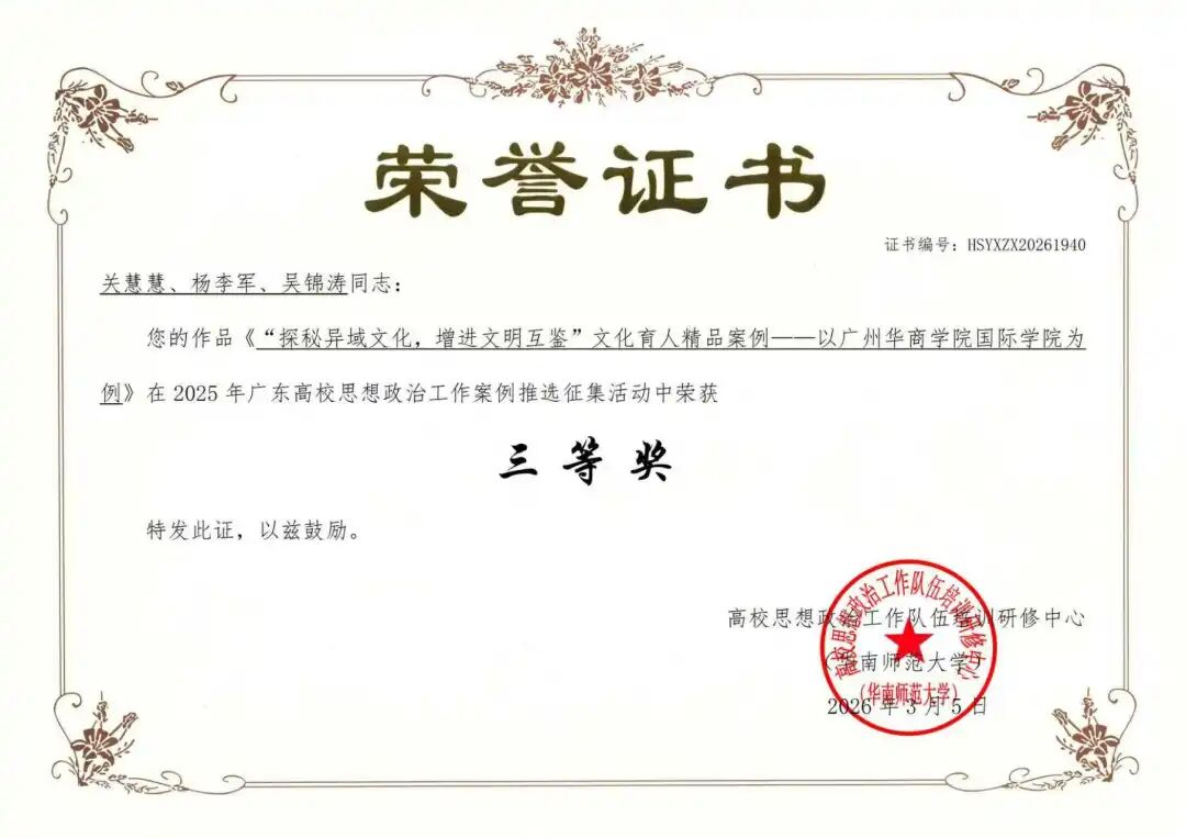 关慧慧、杨李军、吴锦涛老师的《“探秘异域文化,增进文明互鉴”文化育人精品案例——以广州华商学院国际学院为例》荣获2025年广东高校思想政治工作案例三等奖。