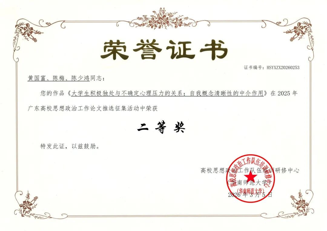 黄国富、陈梅、陈少鸿老师的《大学生积极独处与不确定心理压力的关系:自我概念清晰性的中介作用》荣获2025年广东高校思想政治工作论文二等奖。